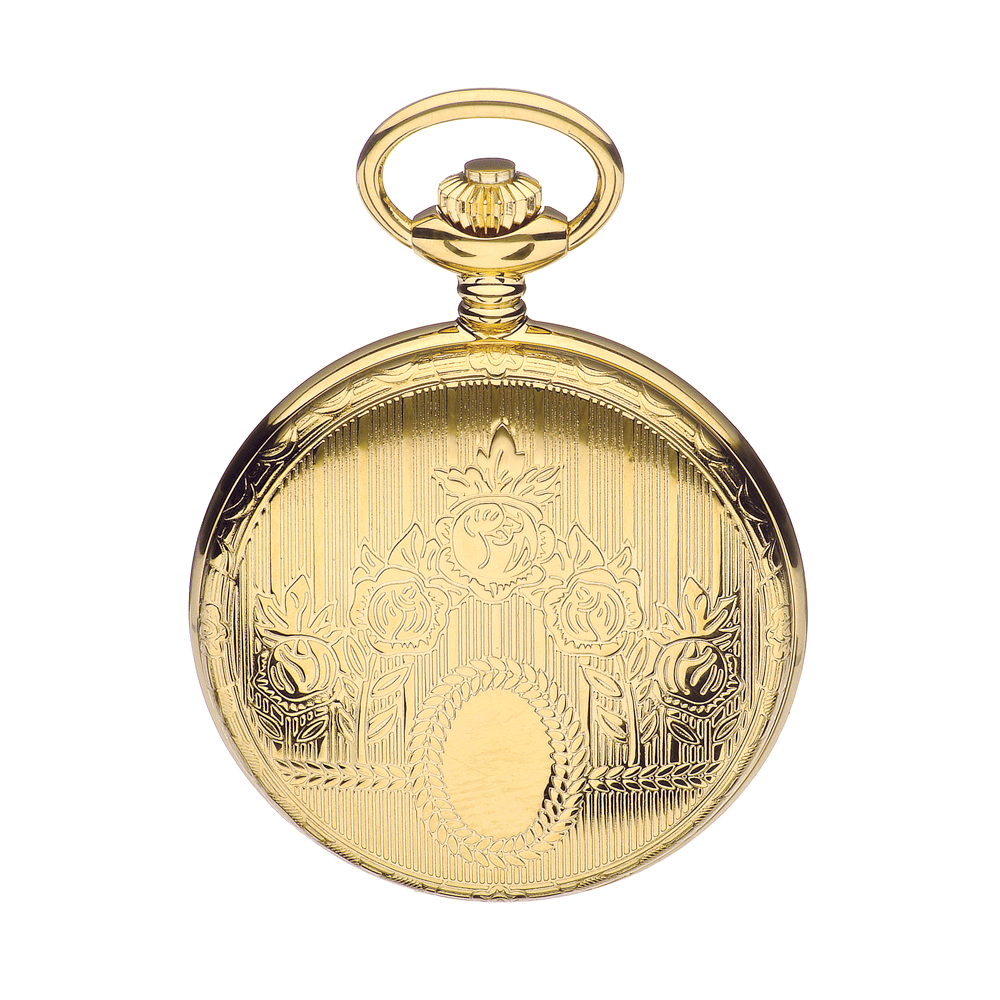 This superb Mount Royal pocket watch features a quartz calendar movement and classic white Roman dial. The watch face is surrounded by a gold plated case complete with a polished back.